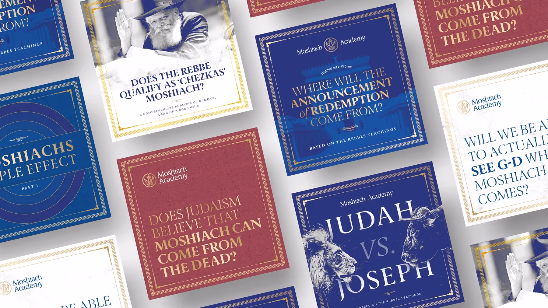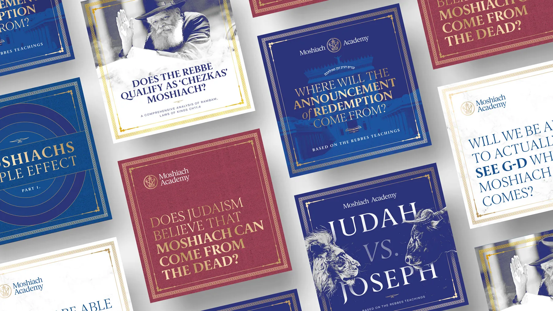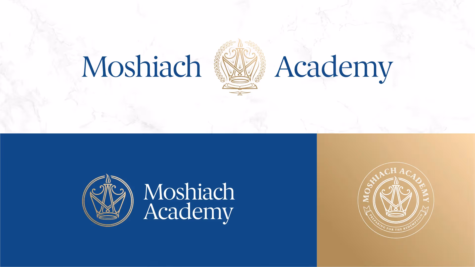 The brand strategy approach helped us determine the brand archetype as a mix of both the Sage and Ruler which is reflected in the name; Moshiach (Ruler) and Academy (Sage), and also informed the design direction to be something both academic and regal.