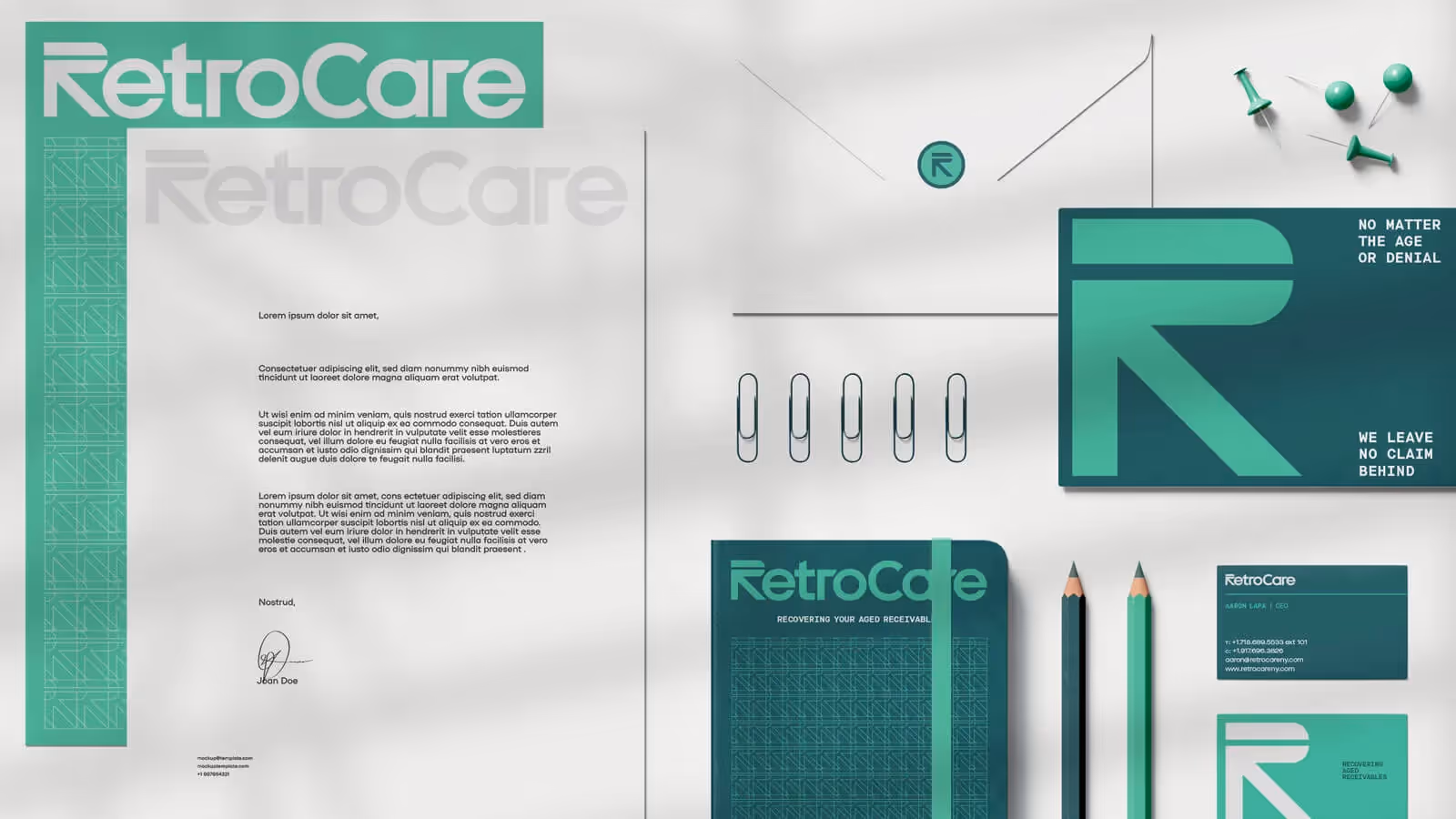 The bold logotype reflects the confidence RetroCare approaches the market in appealing to its ‘results focused’ target audience. The green color theme was chosen as its commonly associated with both the medical and financial sectors, both of which intersect with RetroCare.