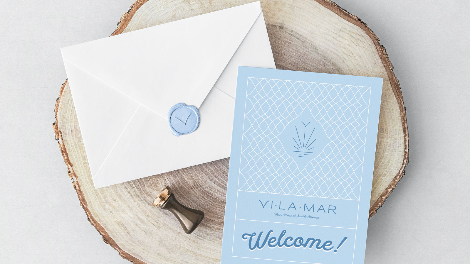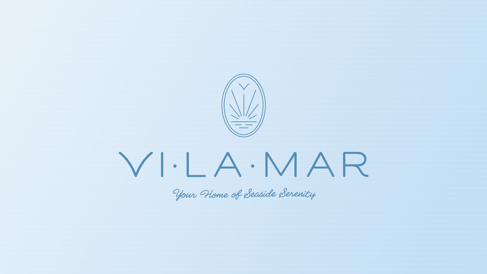 The logo mark features a single soaring bird in the shape of a 'v' above the sun and sea, symbolizing serenity and renewal while anchoring the brand to its beachfront location. A soft coastal color palette reflects both the home and its surroundings, evoking calm and relaxation. The tracked, rounded logotype paired with a handwritten tagline, and the oval shape further reinforce the spirit of serenity.